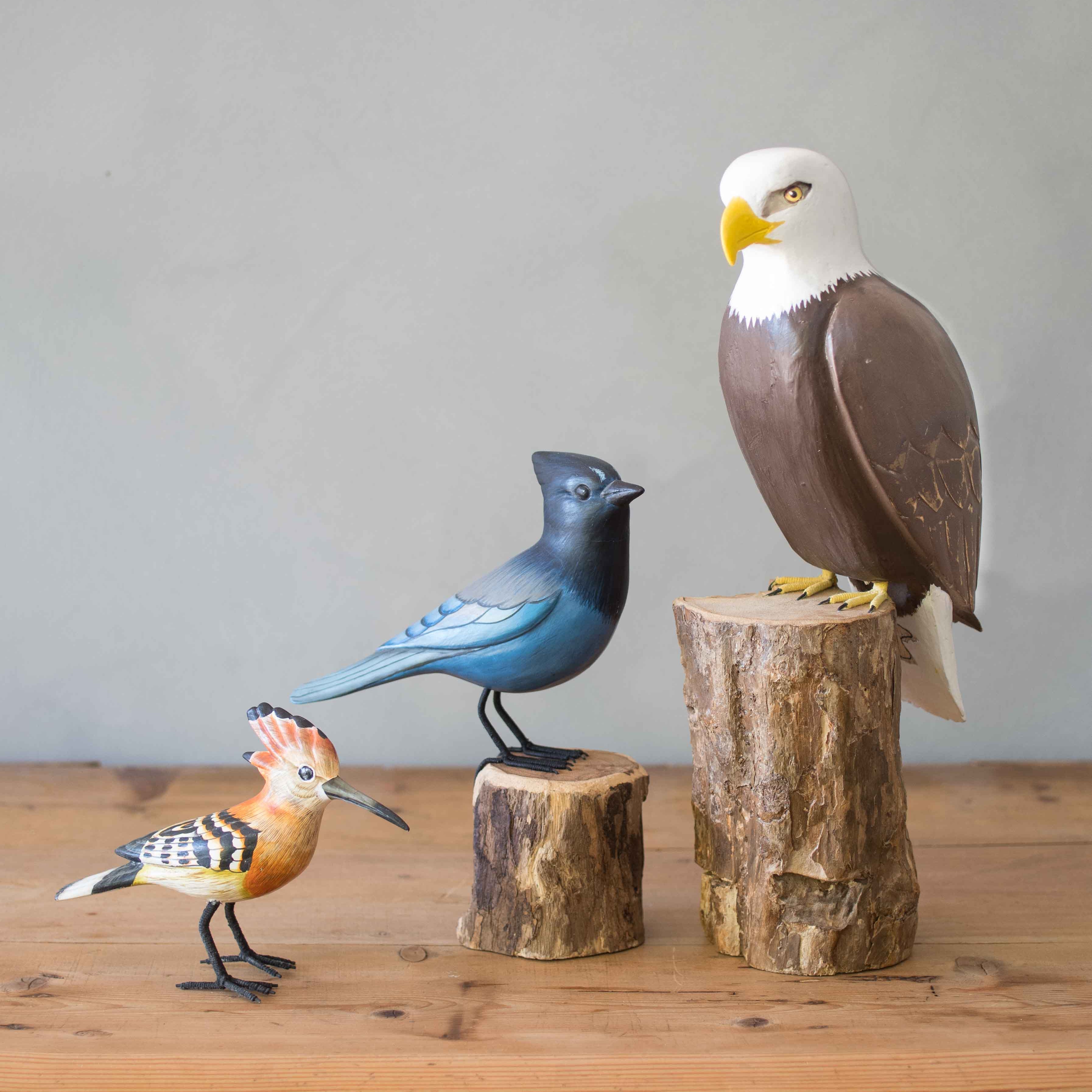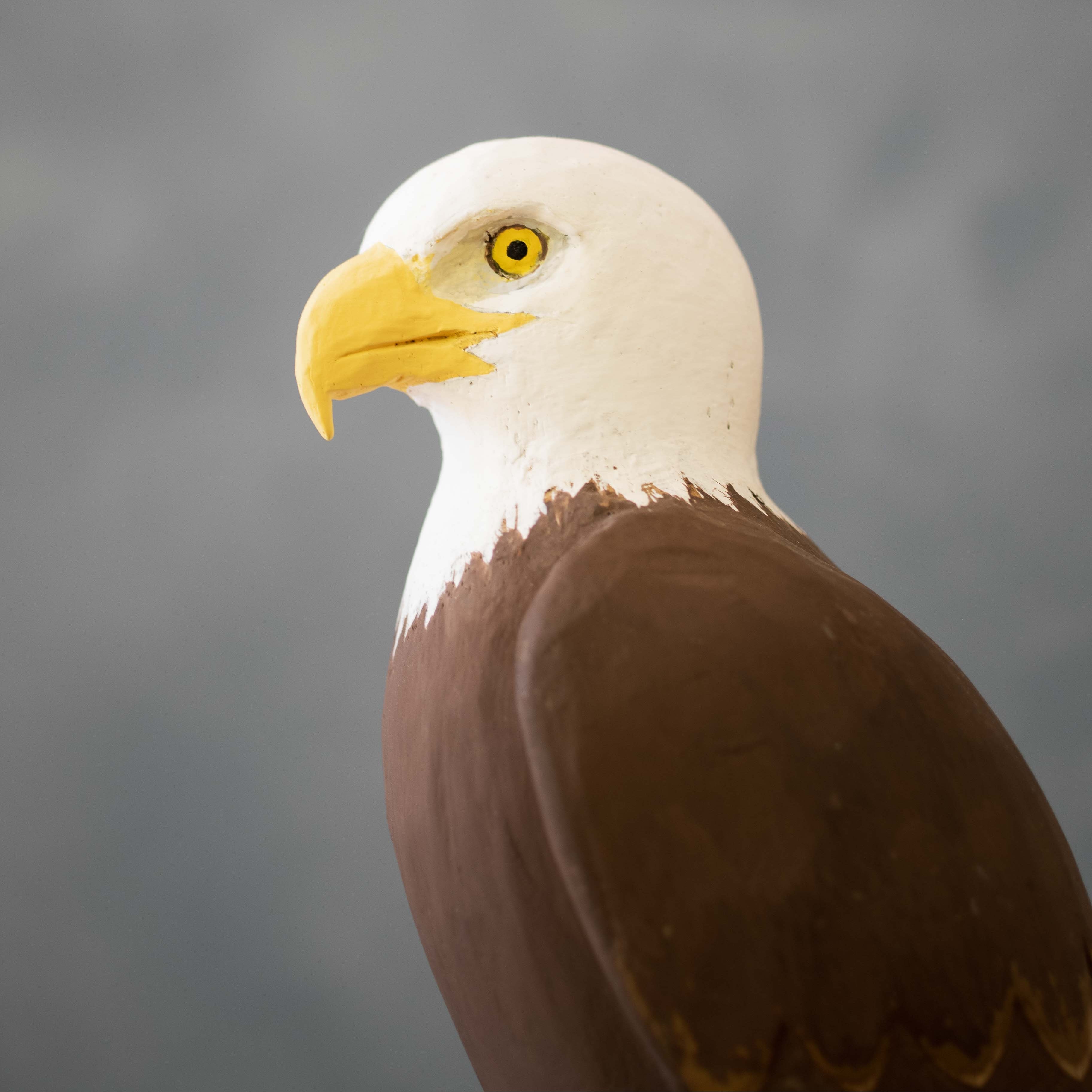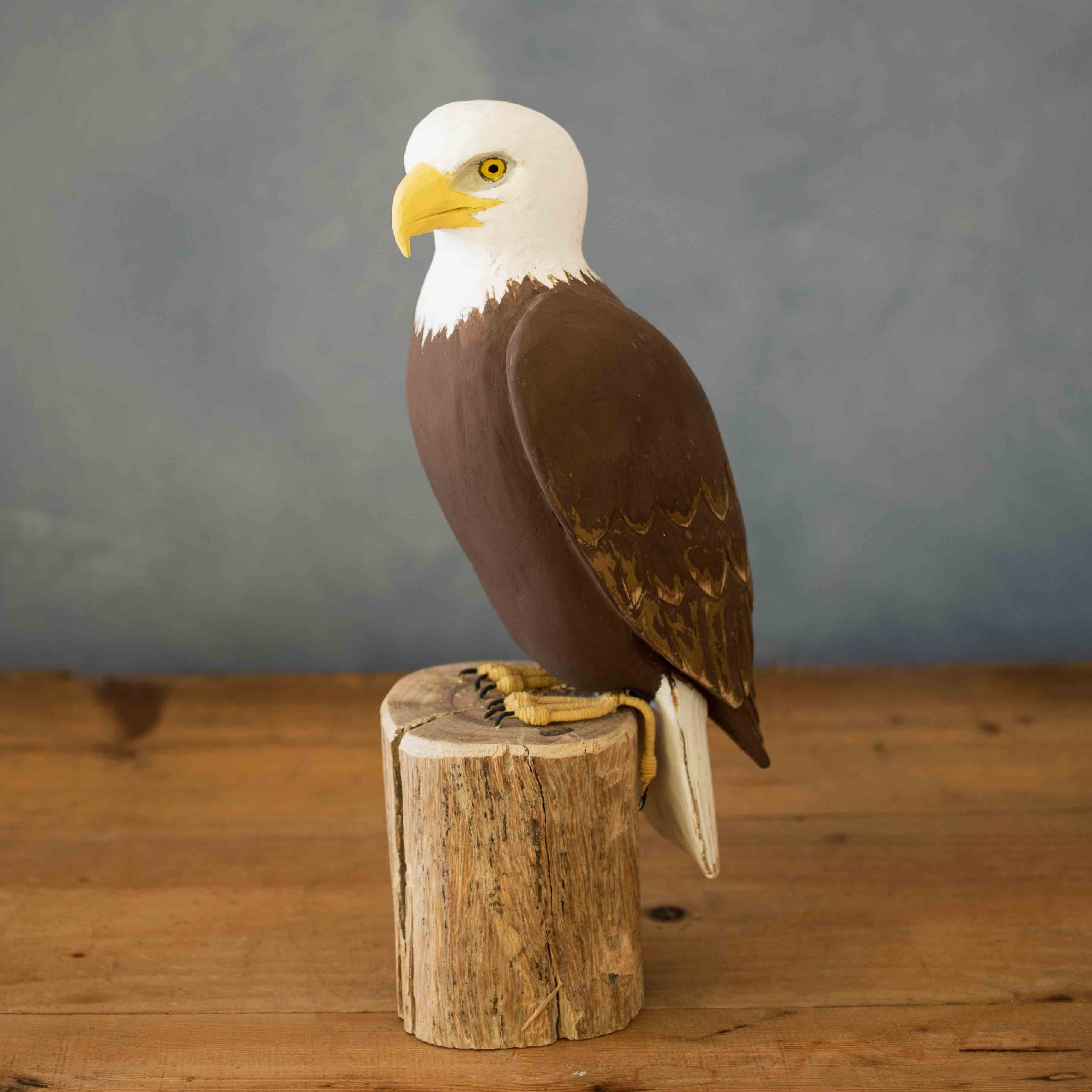 Celebrate the power and beauty of the bald eagle with this striking hand-carved wooden sculpture. Perched on a natural stump base, this detailed carving captures the fierce gaze and iconic form of one of North America’s most recognized birds.